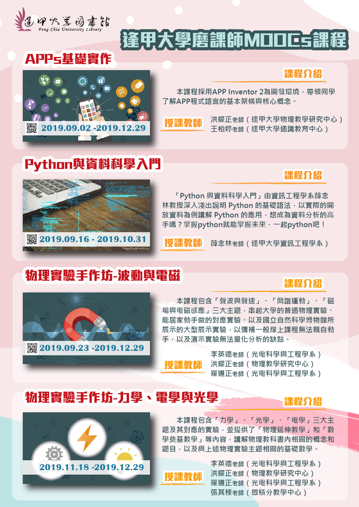 逢甲大學磨課師課程即日起在中華開放教育平台陸續開課,推出「APPs基礎實作」、「Python與資料科學入門」及「普通物理實驗手作坊-波動與電磁」、「普通物理實驗手作坊-力學、電學與光學」四門線上課程。課程修習完畢並完成課程要求,將獲得該課程之「修課證明」。