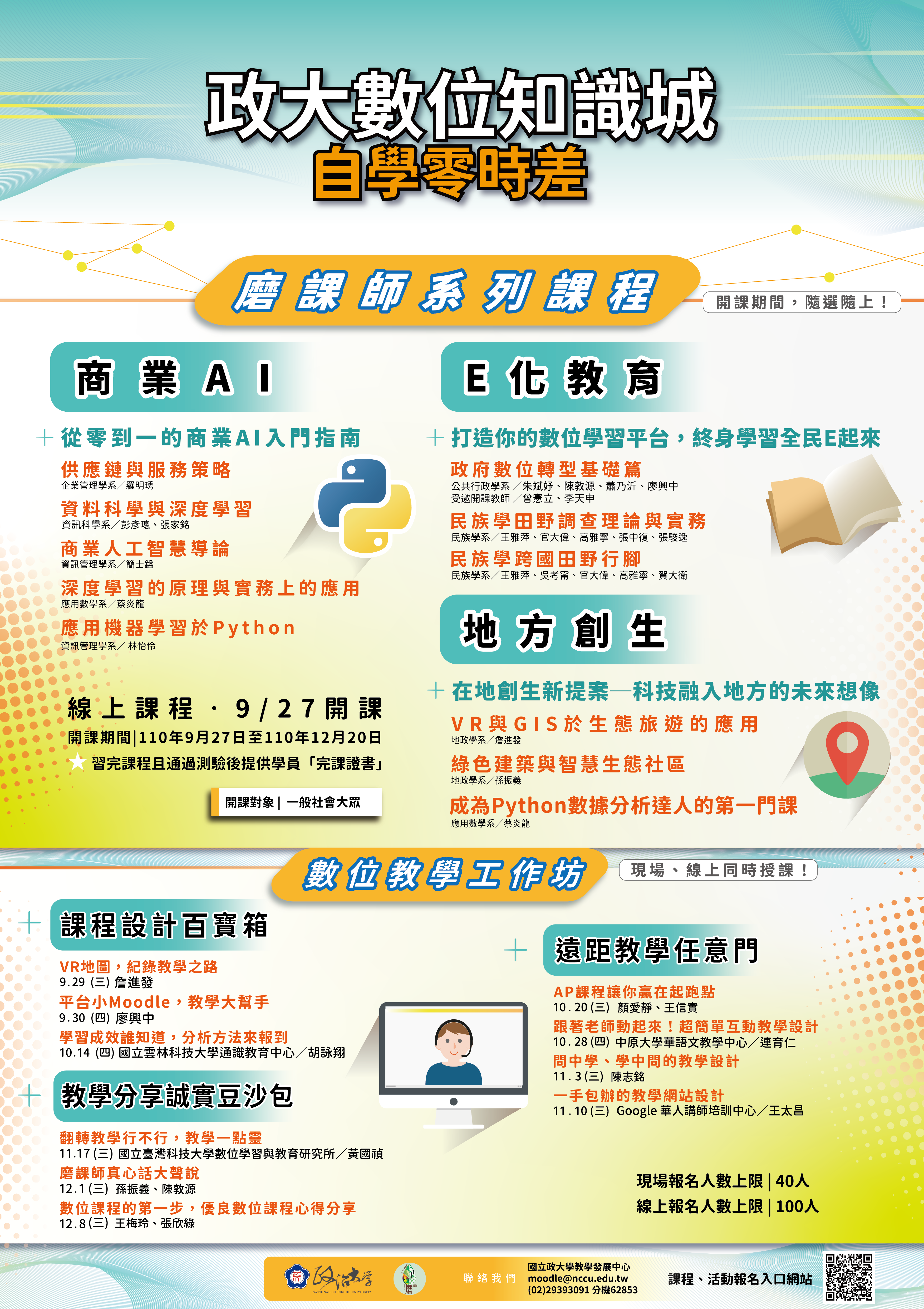 【轉知】國立政治大學「政大數位知識城」110學年度第1學期開設11門磨課師(MOOCs)課程與10場線上數位教學工作坊,即日起開放免費修習,敬邀貴校師生同仁踴躍報名參加,請查照。