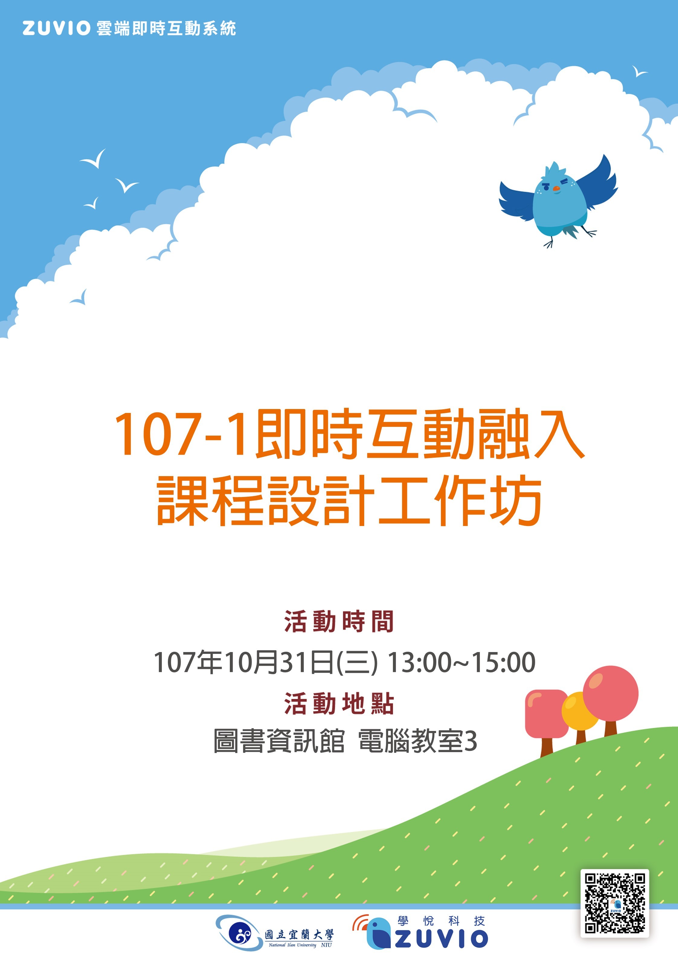 107-1即時互動融入課程設計工作坊 歡迎老師和助教參加 時間:107年10月31日13:00~15:00 地點:圖資館 電腦教室3 13:00~13:10 開場 13:10~13:50 Zuvio 同儕互評功能介紹 13:50~14:30 講師分享各合作夥伴使用zuvio心得 14:30~15:00 Q & A **本演講提供教師知能研習時數、多元學習時數2小時 https://www.zuvio.com.tw/