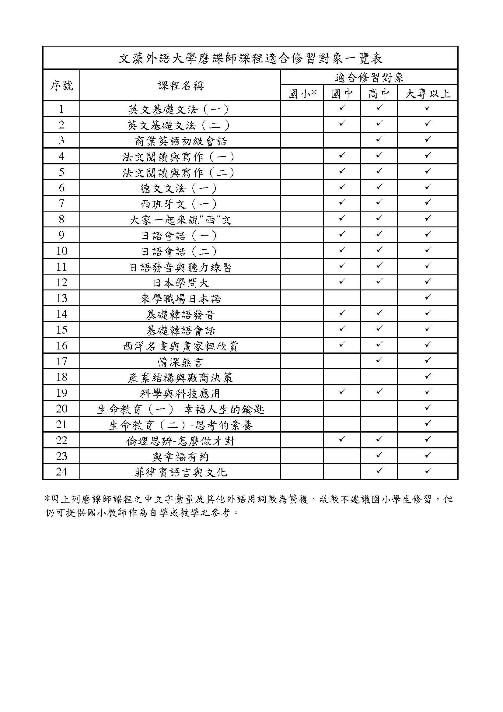 文藻外語大學開設磨課師課程共計24門,課程列表及適合修習對象一覽表如圖,