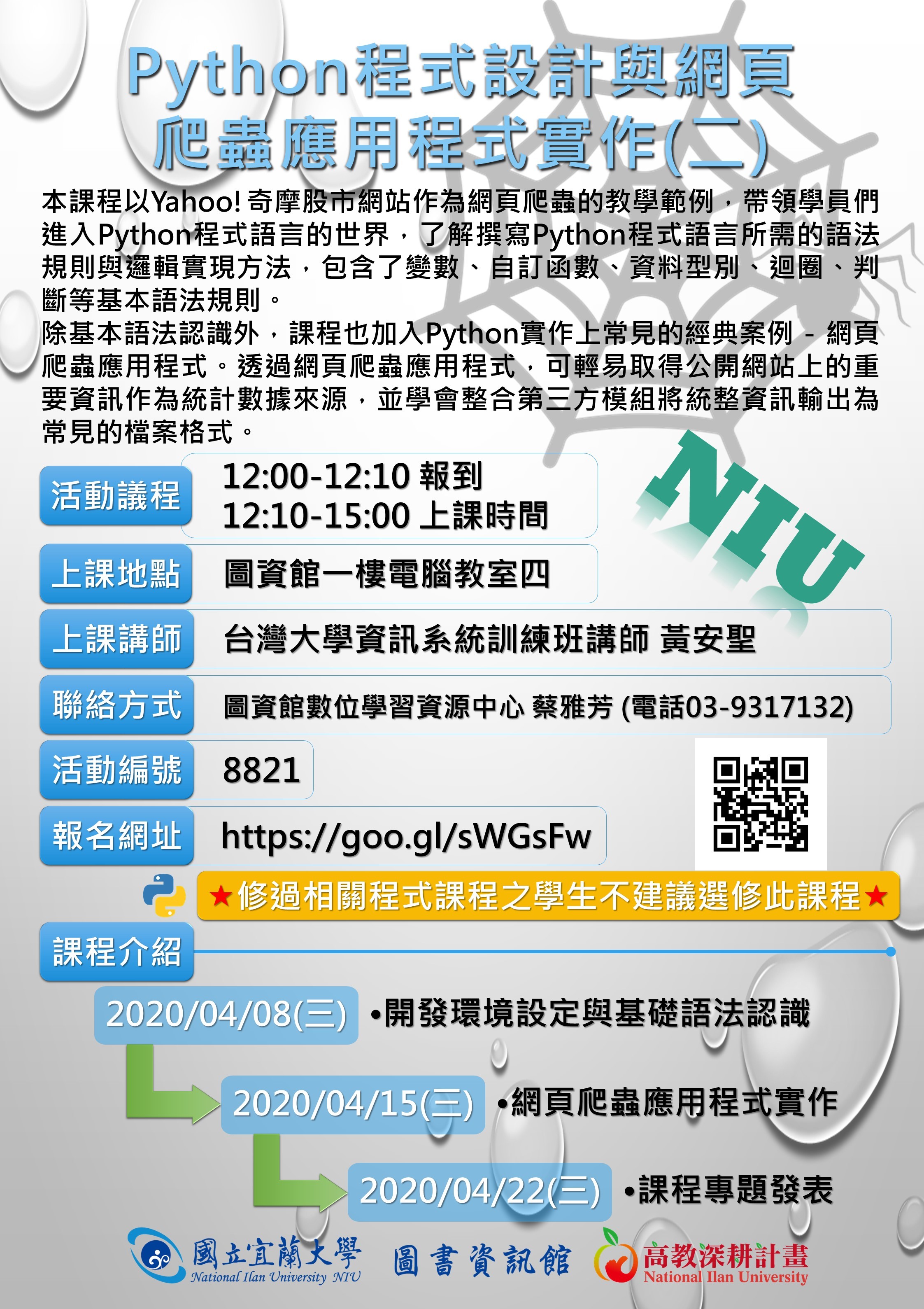 【高深分項二】Python程式設計與網頁爬蟲應用程式實作(二)微學分課程,歡迎全校師生踴躍報名參加