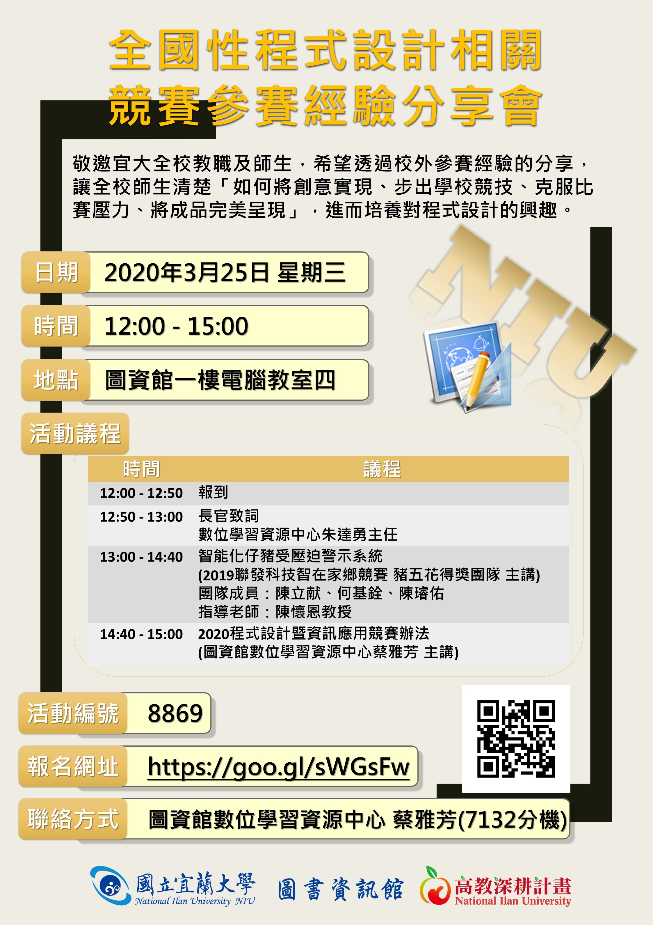 敬邀宜大全校教職及師生,希望透過校外參賽經驗的分享,讓全校師生清楚「如何將創意實現、步出學校競技、克服比賽壓力、將成品完美呈現」,進而培養對程式設計的興趣。 活動時間:2020年3月25日星期三 12:00 - 15:00 活動地點:圖資館一樓電腦教室四 活動講師:2019聯發科技智在家鄉競賽 豬五花得獎團隊 團隊成員:陳立?、何基銓、陳璿佑;指導老師:陳懷恩教授 得獎網址:https://geniusforhome.mediatek.com/cement_2019 活動編號:8869 邀請對象:宜蘭大學全校師生 活動議程:12:00-12:50 報到 12:50-13:00 長官致詞 13:00-14:40 智能化仔豬受壓迫警示系統 (2019聯發科技智在家鄉競賽 豬五花得獎團隊 主講) 14:40-15:00 2020程式設計暨資訊應用競賽辦法 (圖資館數位學習資源中心蔡雅芳 主講) 活動聯絡人:圖資館數位學習資源中心 蔡小姐(分機7132) 備註: 1.進入電腦教室應遵守教室上課規則,且嚴格禁止攜帶任何食物進入教室,將於會後提供西點餐盒。 2.全程參與活動之師生,給予學生多元學習認證2小時、教師知能研習時數2小時、公務人員終身學習時數2小時。 3.本校有意願參加的本校職員,請先徵得單位主管同意後,再行報名參加。 4.因應新冠肺炎疫情,學員進入教室上課前,需量體溫及使用酒精消毒雙手,如咳嗽者請戴口罩。 圖資館數位學習資源中心敬啟