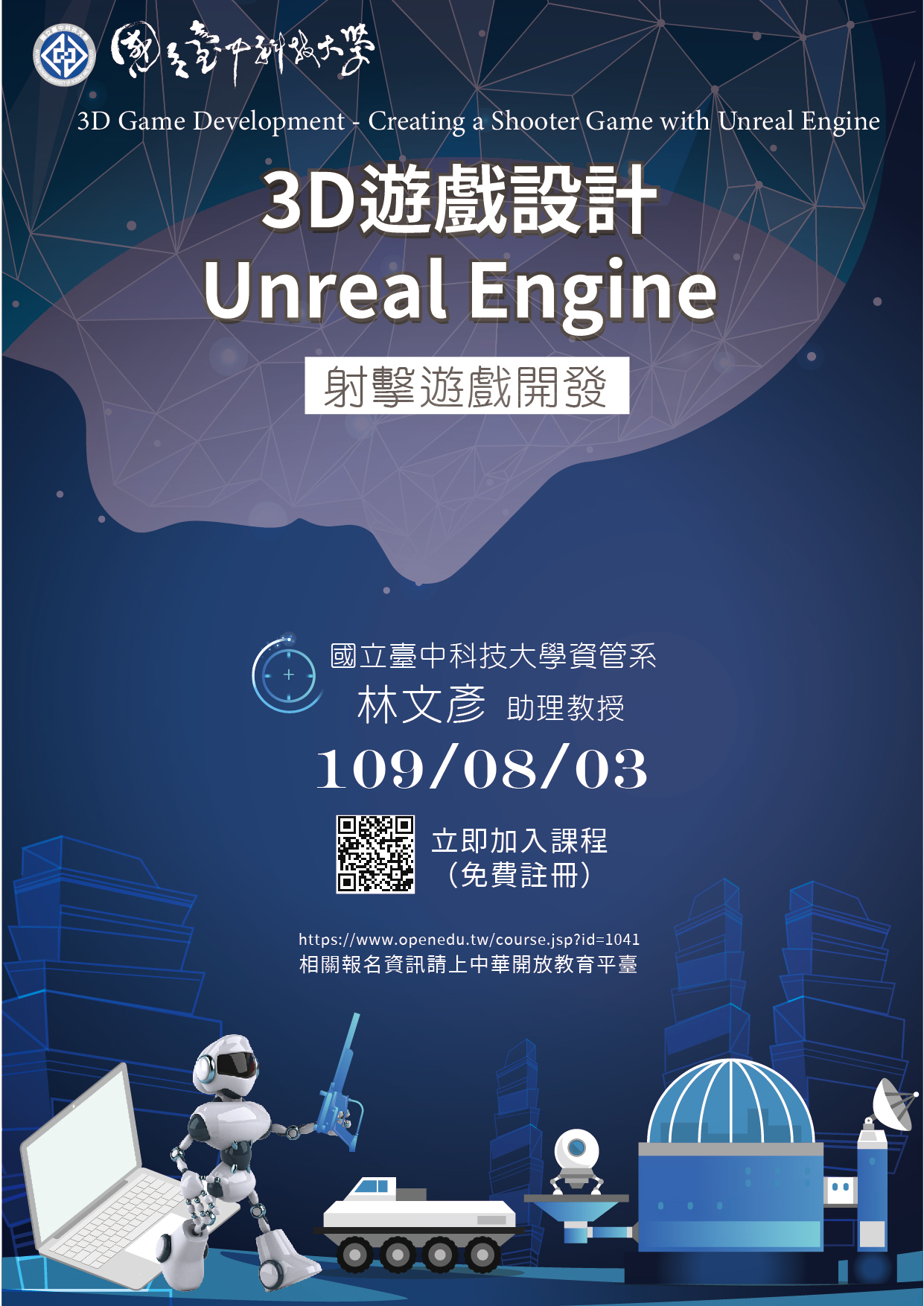 國立臺中科技大學3D遊戲設計- Unreal Engine 射擊遊 戲開發課程業於中華開放教育平臺上線,歡迎師生或同仁踴躍報名修課