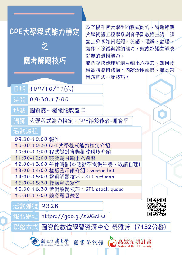 【高深分項二】CPE大學程式能力檢定之應考解題技巧研習課程,歡迎全校師生踴躍參加